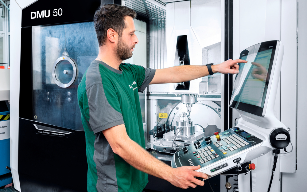 The Robo2Go has already been compatible with turning machines and turn-mill centers for several years. As Robo2Go Milling, it has also been used to automate machining centers such as the DMU 50 since 2020. “The fact that DMG MORI provides the tool machines as well as the automation from a single source, simplifies the installation enormously,” is the opinion of Andreas Dichter. The easy operation of the flexible Robo2Go products is its key feature. The team at AMBEG has already experienced this: “Teaching the Robo2Go does not require any special robot programming knowledge.” The CNC machine is operated via the CELOS control panel.
