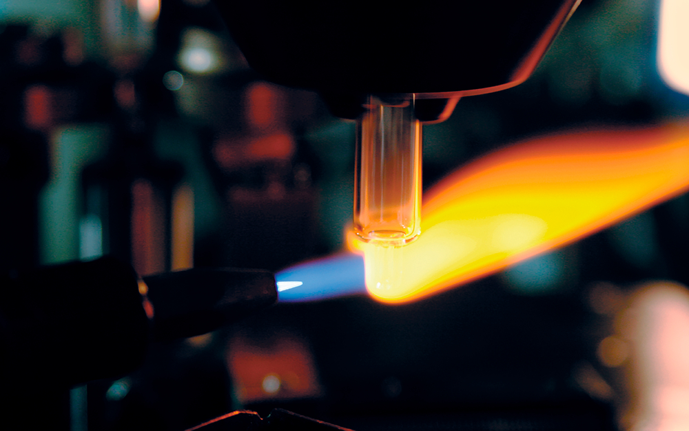 “Glass syringes and vials continue to be important packaging material in the pharmaceutical industry,” explains Andreas Dichter, managing director of AMBEG. He heads up the company in the third generation. “For example, annual flu vaccinations are administered using single-use glass syringes.” The production of glass packaging takes place using the same principles as it did almost 70 years ago. The AMBEG glass processing machines are equipped with a carousel with up to 20 stations. Glass tubes are used as the raw material, which are shortened to the corresponding lengths and molded. The diameter of the tubes ranges from ø 6 to ø 55 mm. The glass is heated to around 800 °C by several gas burner to prepare it for processing. The finished molded glass products are subjected to camera-based visual inspections and measurements before being heated to 600 °C in a furnace and then slowly cooled down. “This stress relief procedure makes the glass packaging very stable,” says Andreas Dichter, explaining this process step.